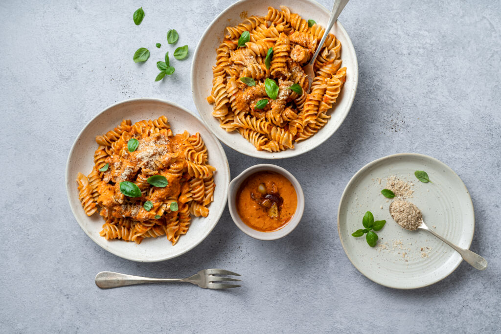 Herrlicher Pastagenuss: Im Ofen gebackenen Peperoni, reichlich Knoblauch und Hefeflocken verleihen der Sauce Cremigkeit und viel Geschmack. Buon appetito!